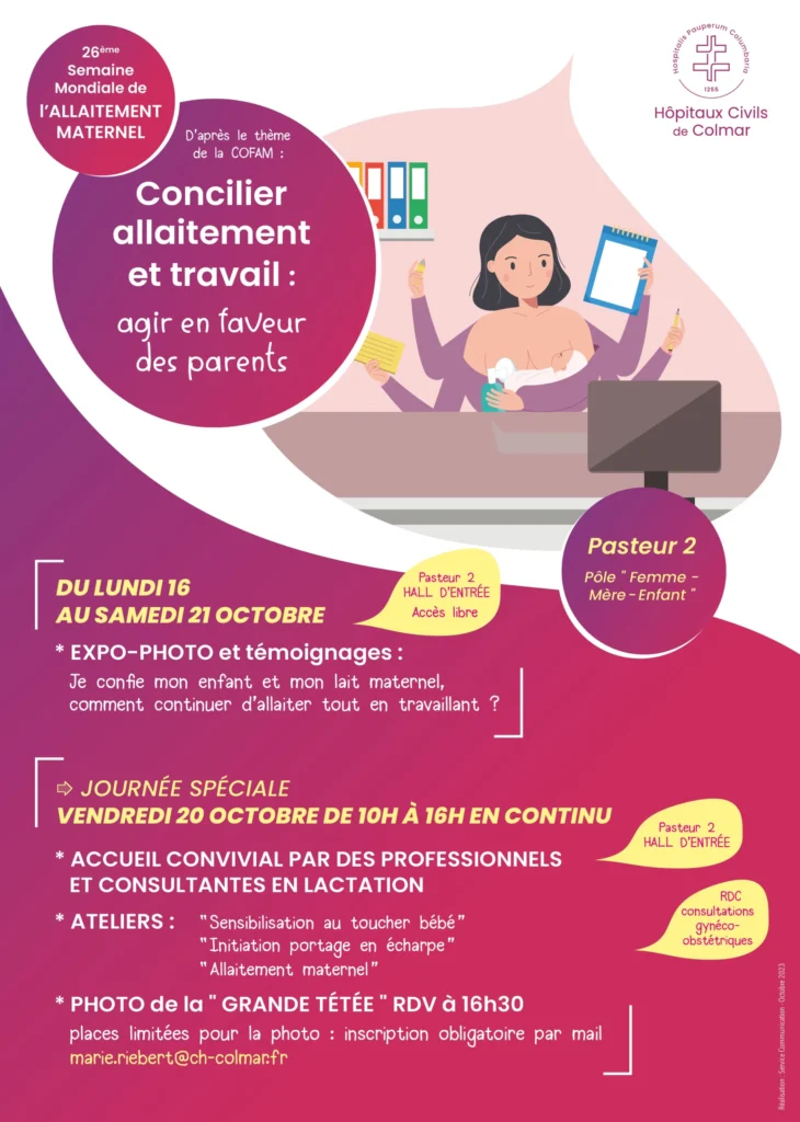 – Du lundi 16/10 au samedi 21/10 : une EXPO-PHOTO sur le thème » Je confie mon enfant et mon lait maternel : comment concilier allaitement et reprise du travail », assortie de témoignages.
