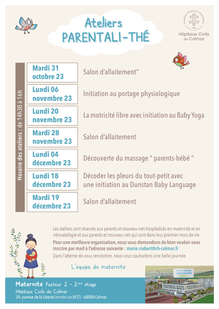 La maternité vous propose 2x/mois des ateliers de parentalité animés par Pascale Bisch, puéricultrice, pour vous permettre un moment de partage et de découverte avec votre enfant. Nous vous invitons à découvrir l’outil bébé signes, vous initier au portage physiologique, au massage bébé et au baby yoga, participer à des ateliers sur d’autres thématiques.