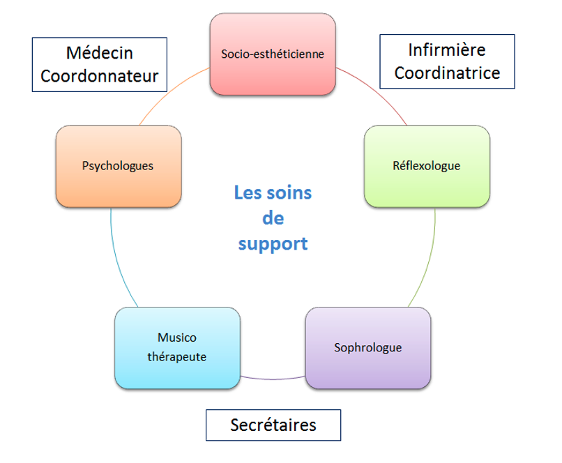4. L’organisation des Soins de Support, qui sont l’ensemble des soins et soutiens nécessaires aux personnes malades conjointement aux soins onco-hématologiques lorsqu’il y en a. Ces soins varient selon les personnes et sont adaptés à chacun. Par exemple, les traitements médicaux des effets indésirables des traitements, comme le traitement des nausées et vomissements, des effets secondaires cutanés, des neuropathies liées aux traitements…mais aussi le soutien social avec l’assistante sociale et le soutien humain avec les psychologues, la sophrologie, la socio-esthétique, la réflexologie, la musicothérapie etc …